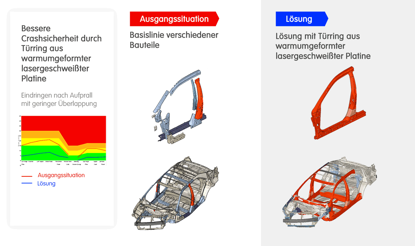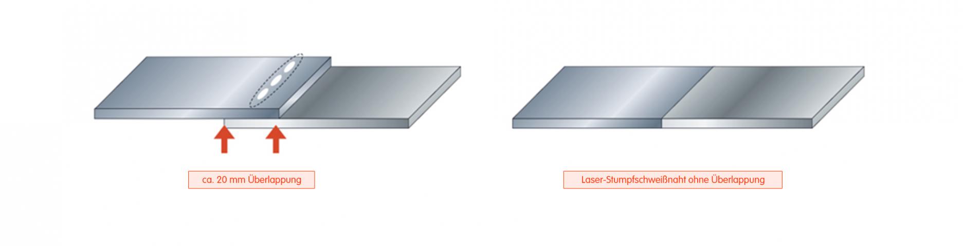 In traditional vehicle assembly, different parts were overlapped to ensure a strong join. With LWBs, overlaps are eliminated in many parts. Instead, the two parts are butt welded, reducing the amount of material used and the overall weight of the part. When combined with thickness optimization, excellent weight savings can be achieved.